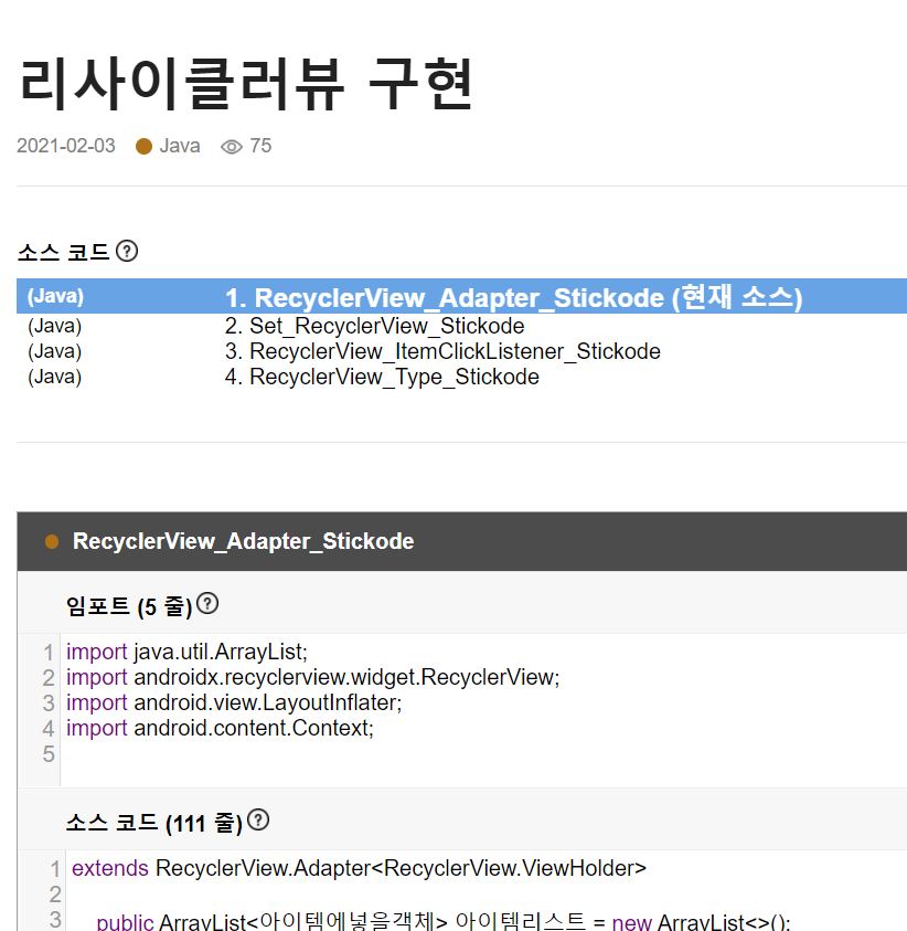 '리사이클러뷰 구현' 포스트를 사용하였고, 일부 메모장 앱에 사용할 수 있도록 수정했습니다.