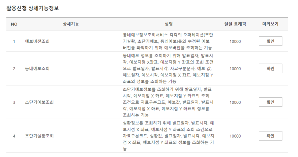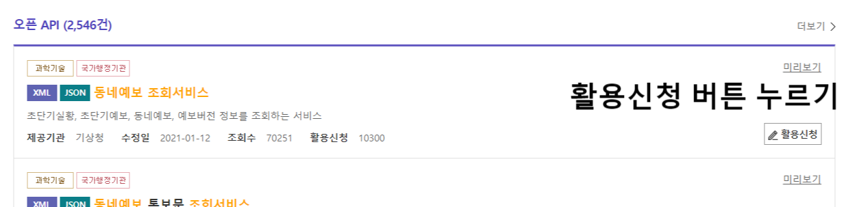 오픈 API 란에서 동네예보 조회서비스 칸을 보시면 우측에 활용신청 버튼이 있습니다.