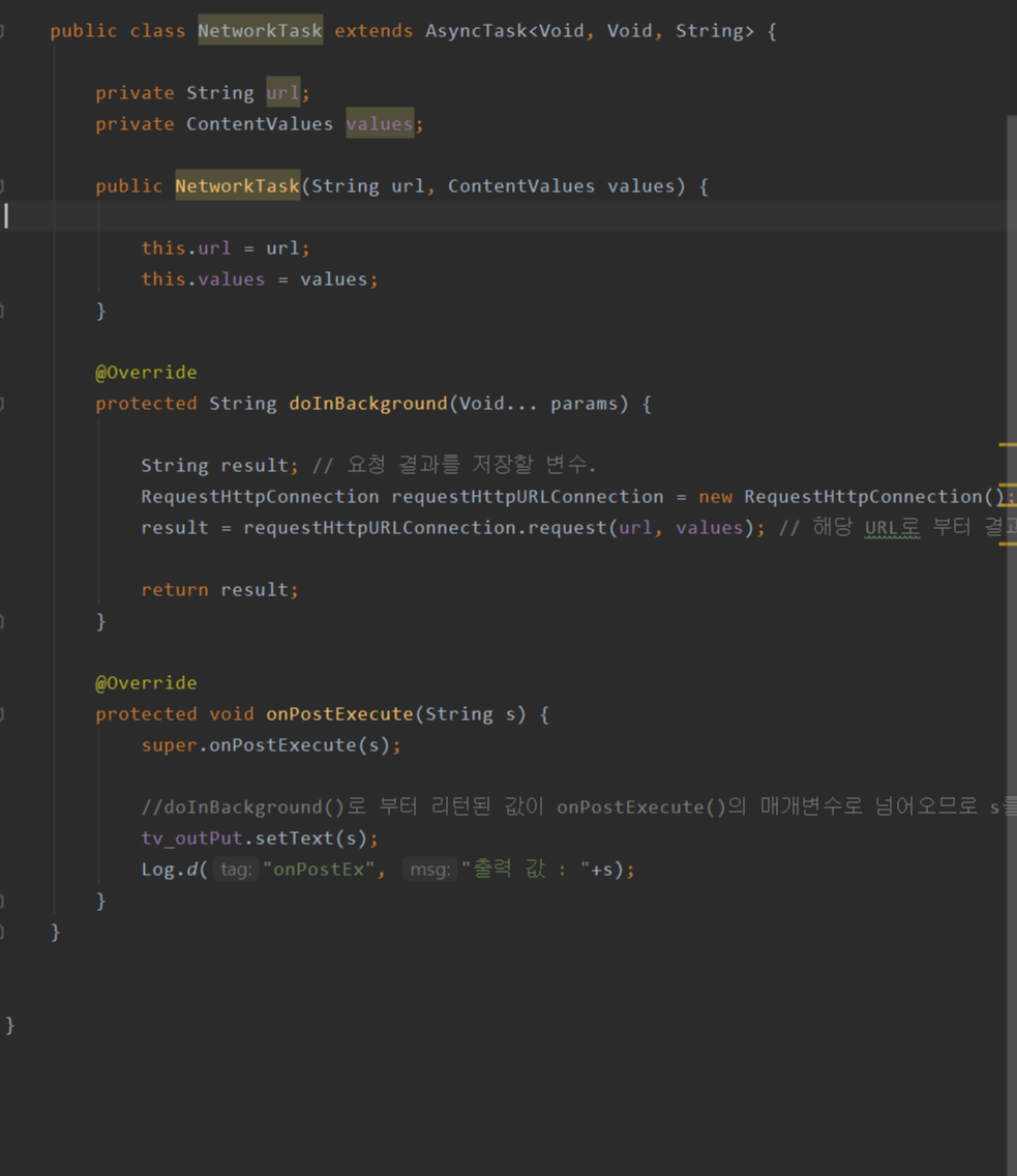 통신 후 출력된 값을 TextView에 출력되도록 처리합니다.