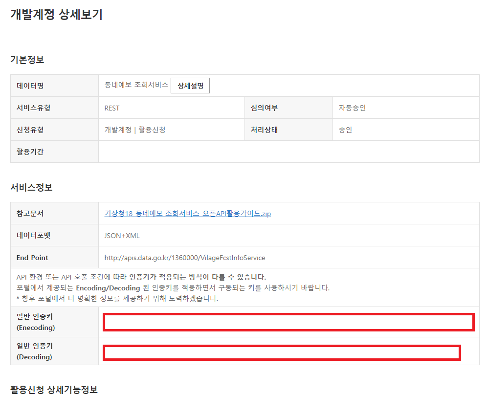 승인 된 '동네예보 조회서비스'를 누르게 되면 개발계정 상세보기가 나오며