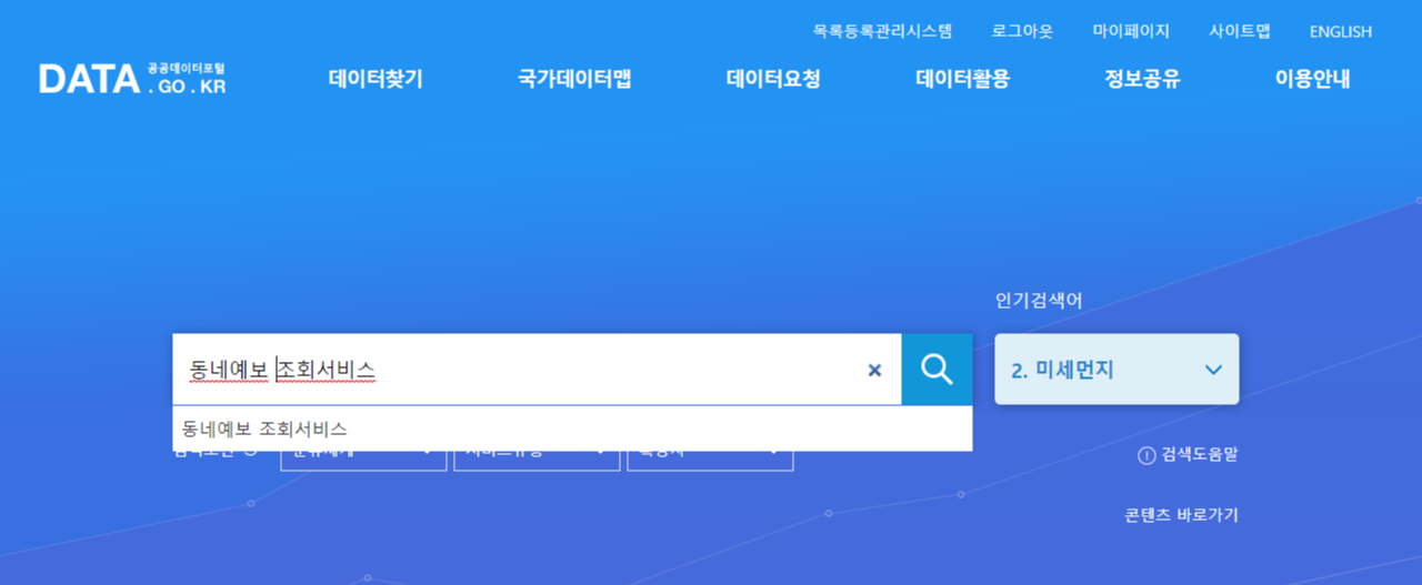 기상청 API인 '동네예보 조회서비스'는 '공공데이터포털'에서 사용 신청이 가능합니다.