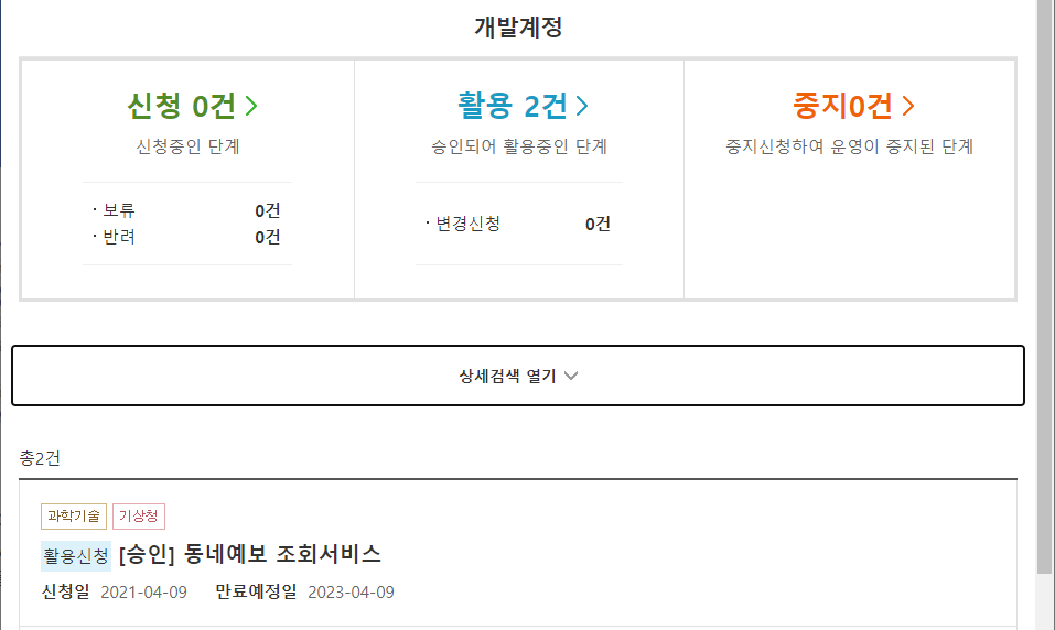 '마이페이지'에 신청 확인이 가능하며, '동네예보 조회서비스'는 자동 승인이 되기 때문에