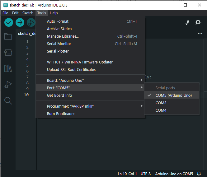 인식이 안 된다면 Tools > Port 를 열어서 선택해주세요.