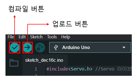 그 옆에 우측 화살표 버튼을 누르면 아두이노 보드에 코드를 업로드합니다.