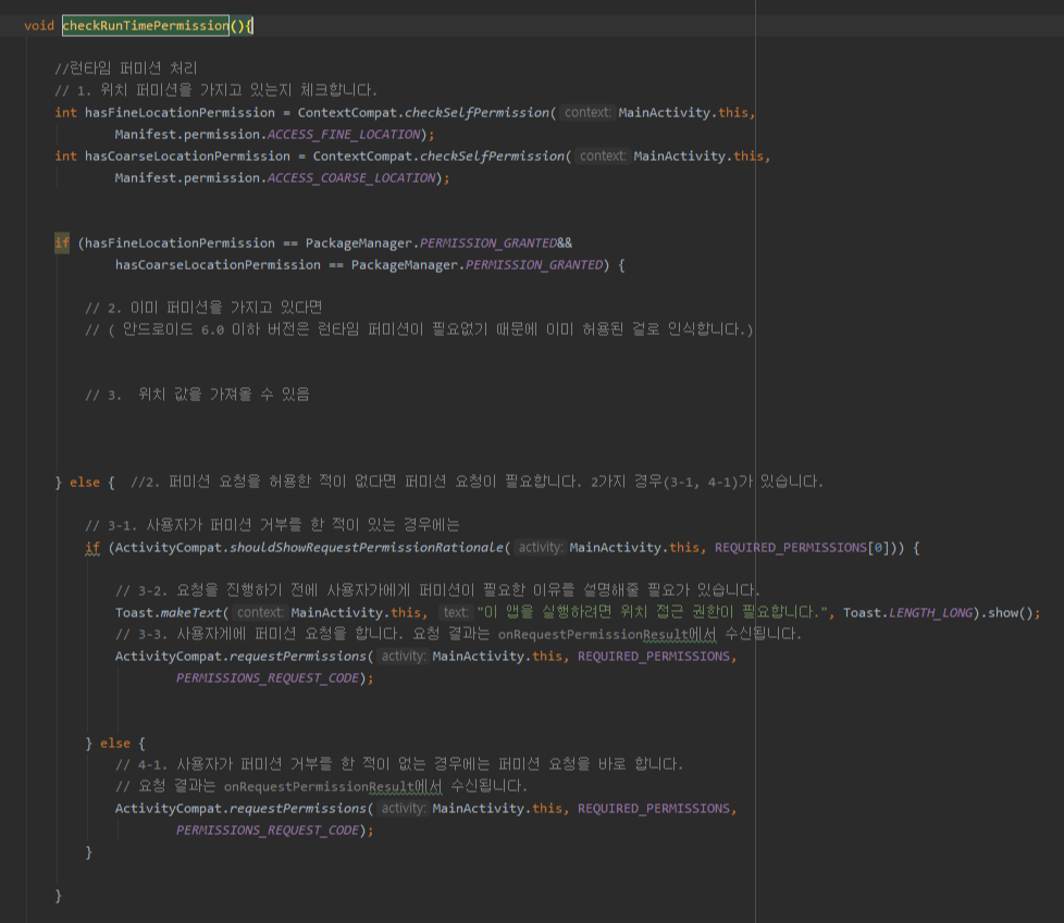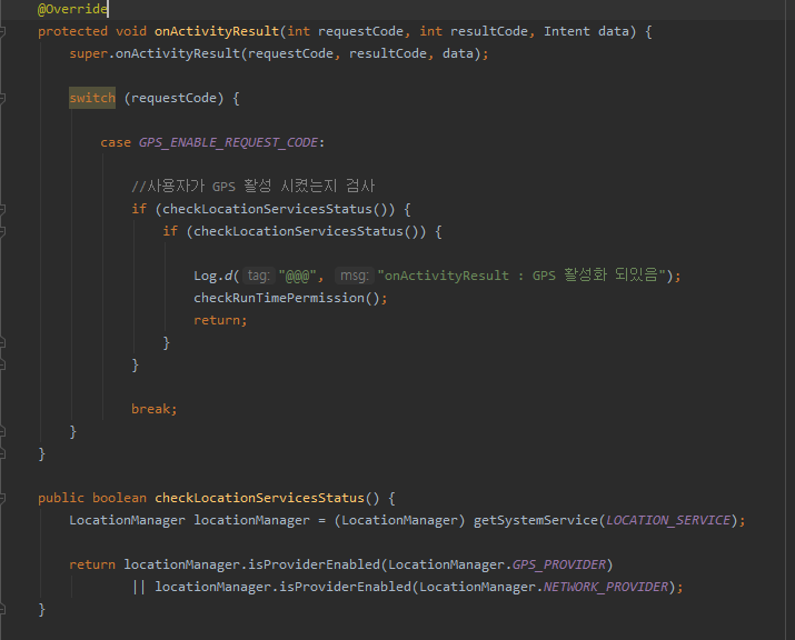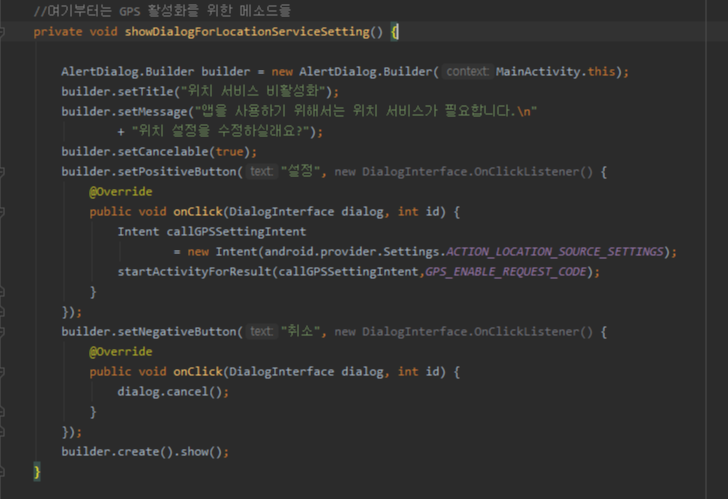 다음으로 GPS 활성화 메소드와 미리 만들었던 GpsTracker, TransLocalPoint 클래스를 사용하도록 합니다.