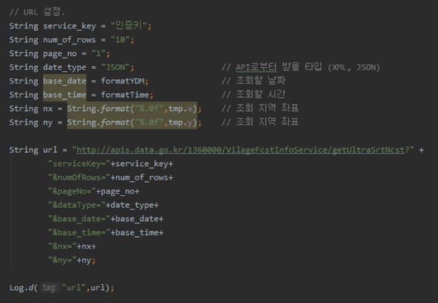앞에서 구한 날짜, 시간, 좌표를 변수에 넣고 데이터 타입은 JSON으로 요청합니다.