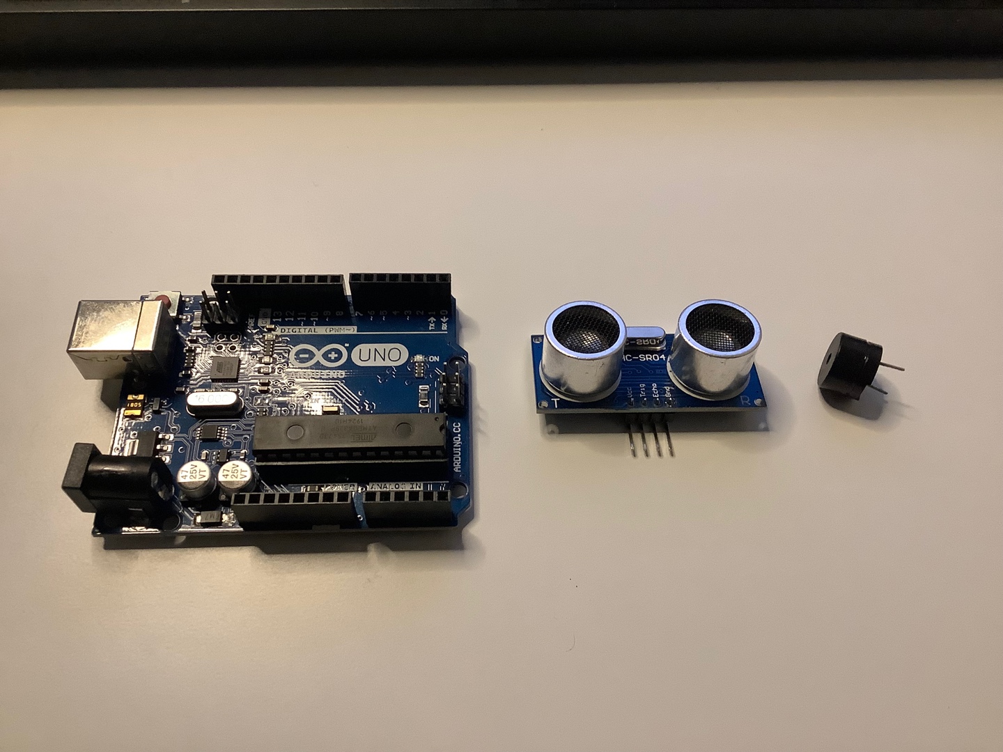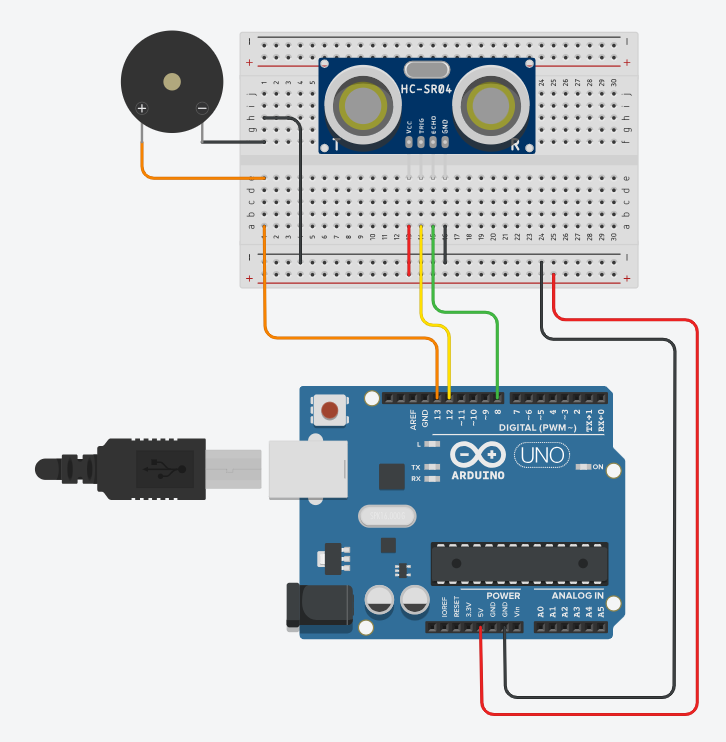 아두이노 우노, 초음파 센서, 피에조 부저를 준비합니다.