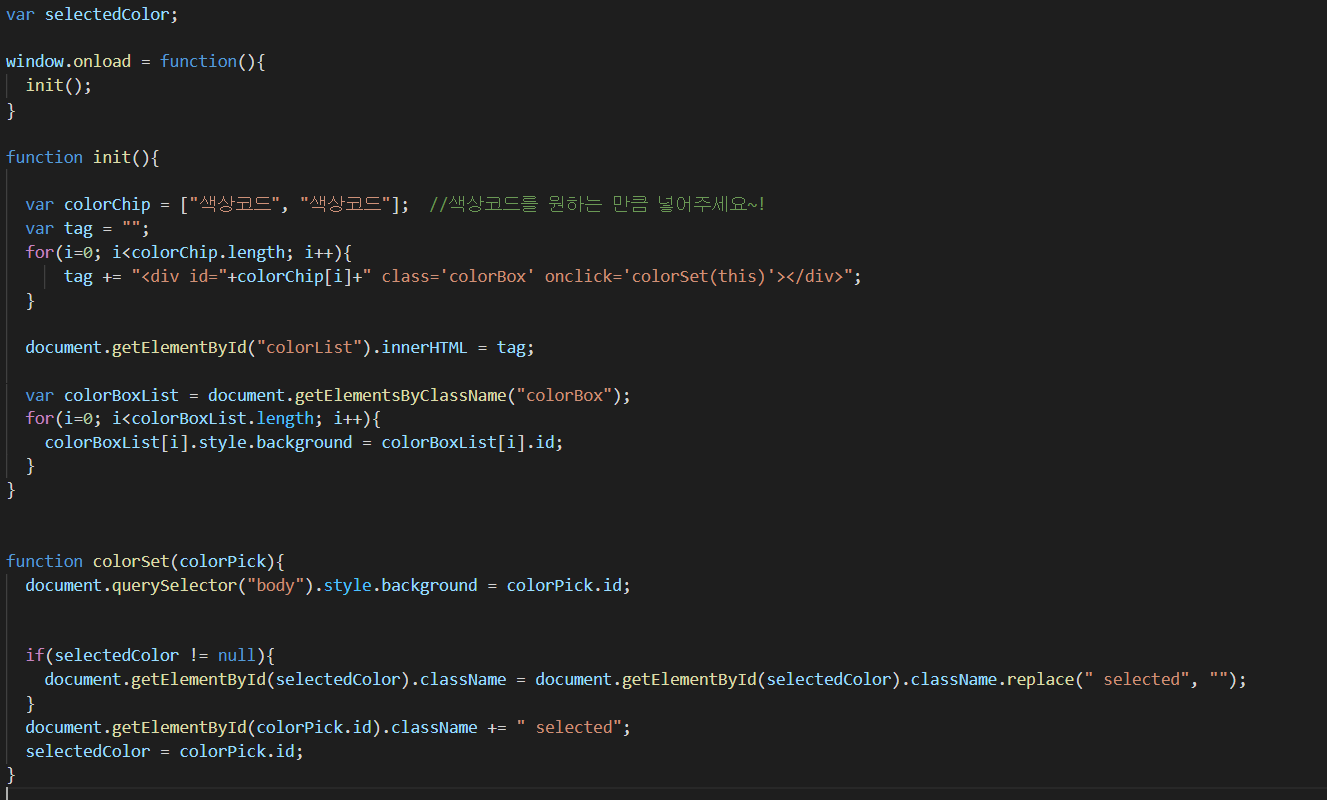 document.querySelector("body").style.background = colorPick.id; //배경색을 선택한 색상박스의 id 값으로 지정해주기
