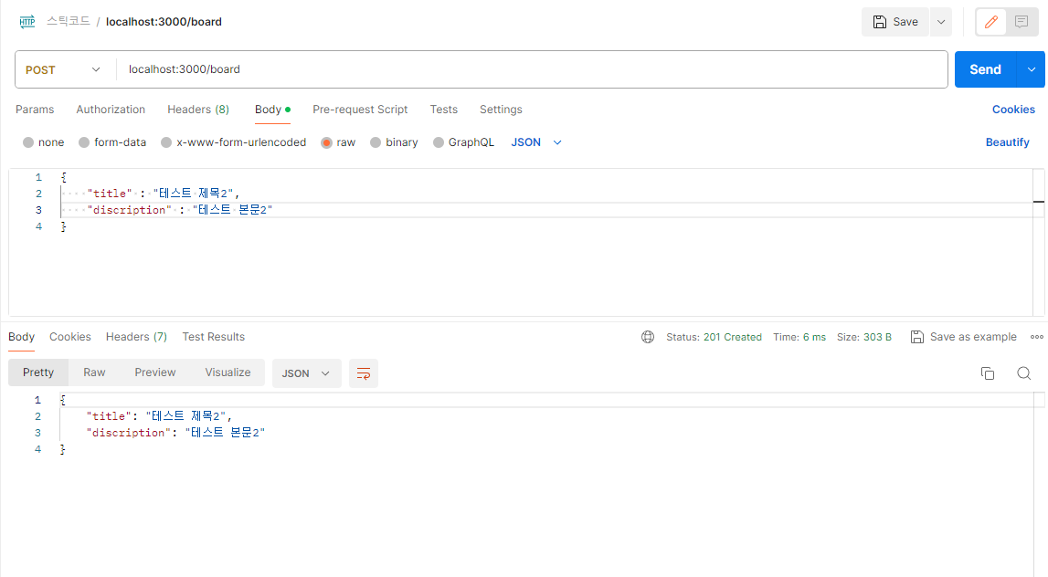 테스트로 1,2 모두 작성하였고 response로 서비스에서 작성한 createBoardDTO형식으로 오는걸 확인할 수 있습니다.