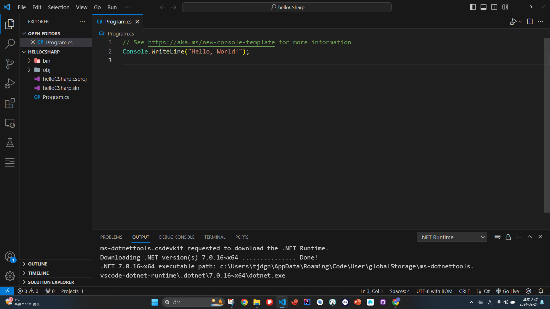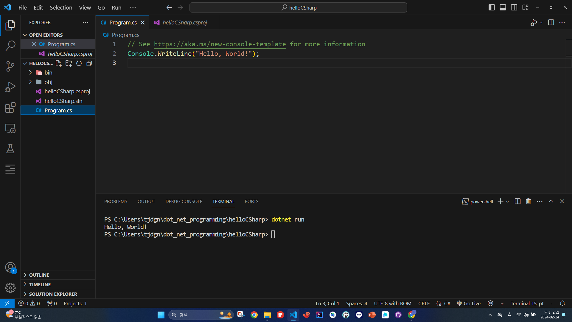 현재 상태에서 터미널에 "dotnet run" 명령어를 입력하고 엔터를 치면 현재 파일을 Top-level statements를 작성한 파일로 인식해 main method 없이도 실행하게 됩니다.