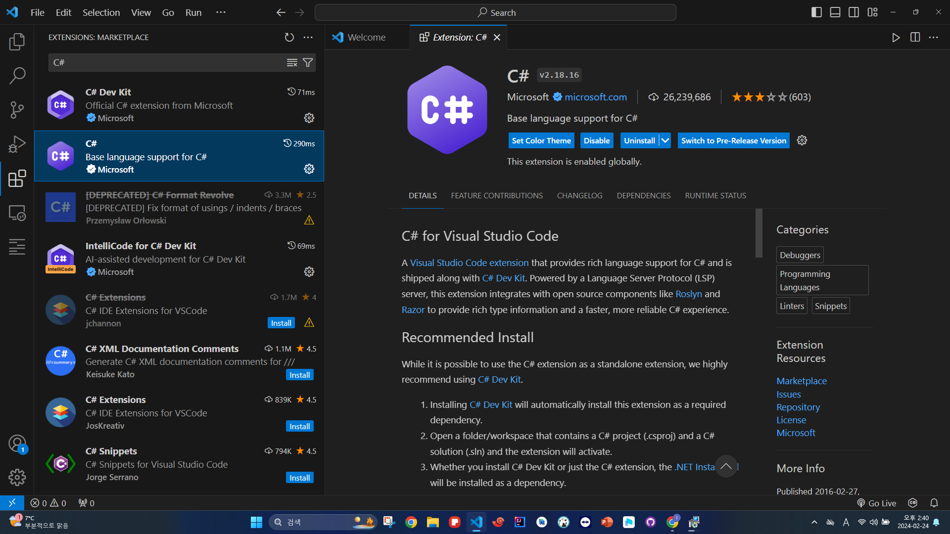 먼저 Visual Studio Code에서 확장 프로그램으로 이동해서 Microsoft 사에서 제공하는 C# 확장 프로그램을 설치해주세요.
