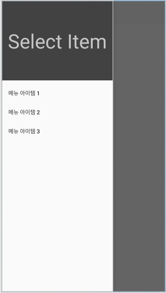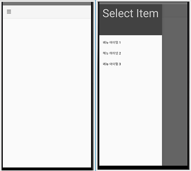 프로젝트를 실행하면 아래 사진같이 나오는데 햄버거 버튼을 누를 경우 네비게이션 드로어가 나오는것을 확인할 수 있습니다.
