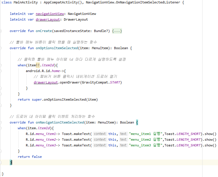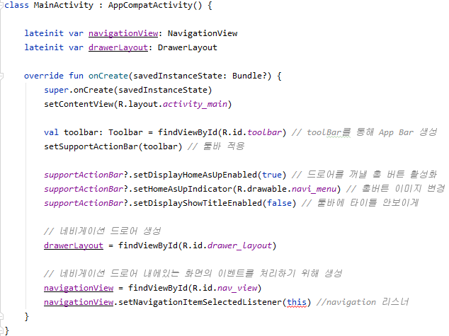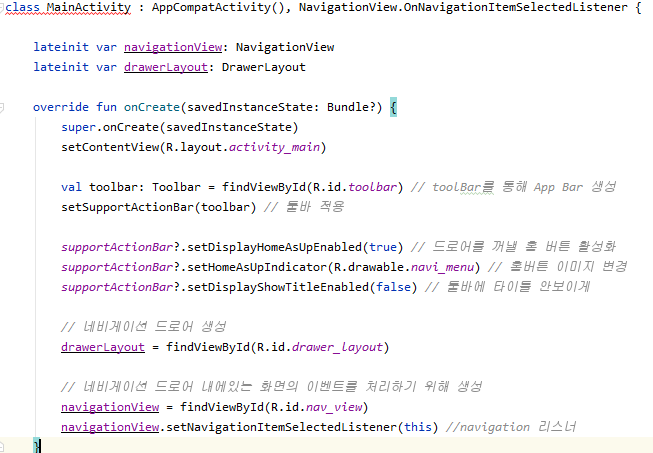 다른 함수에서 사용할 수 있게 navigationView, drawerLayout 변수들을 만들어 줍니다.