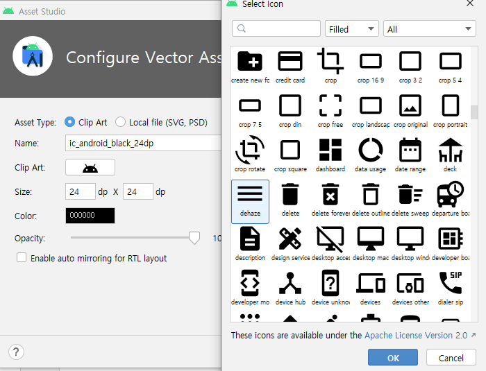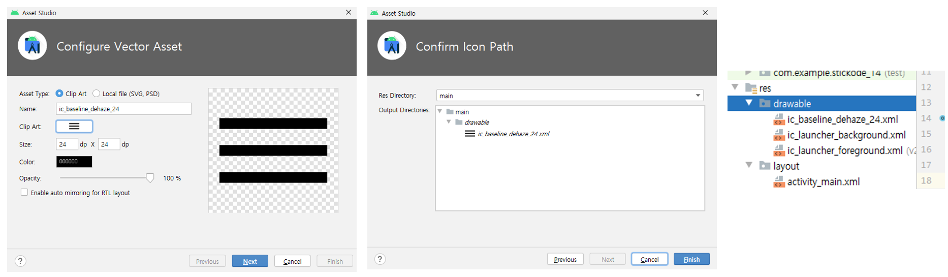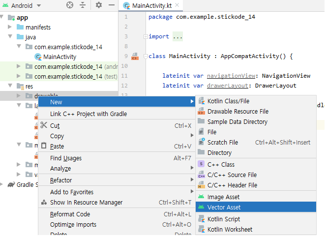 drawable 파일을 우클릭하면 아래 화면같이 나오는데 Vector Asset을 선택해줍니다.