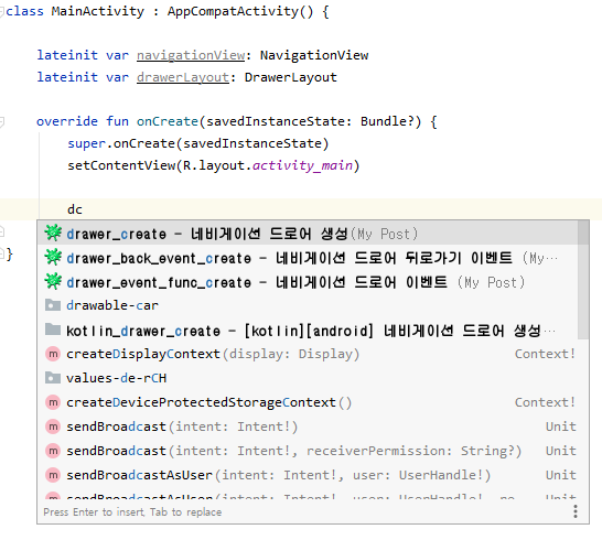그 다음 스틱코드를 활용한다면, 클래스에서 'dc' 까지만 작성했을 때 '네비게이션 드로어 생성' 이벤트가 나타납니다.