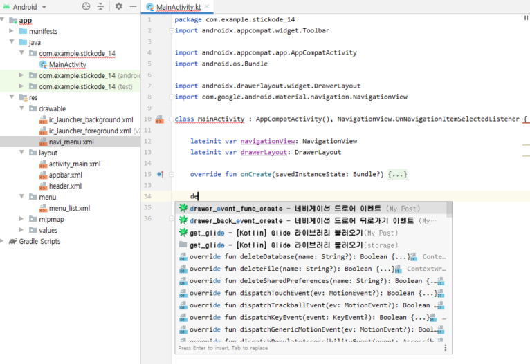 '네비게이션 드로어 생성' 이벤트를 누를 경우 코드가 자동으로 완성됩니다.