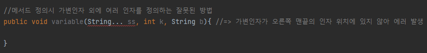 (1) 가변인자 와 여러 인자를 같이 정의한 메서드를 만들 경우 가변인자를 제일 우측 끝에 넣어야 합니다.