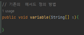 => 위의 이미지 처럼 타입 ... 이름 형식으로 인자 부분을 적어 메서드를 정의합니다.