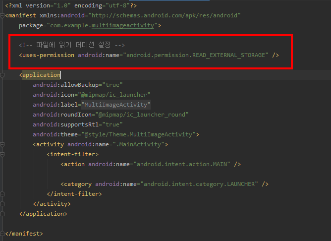 AndroidManifest.xml 파일 안에 파일을 불러오기 위한 권한을 추가해줍니다.