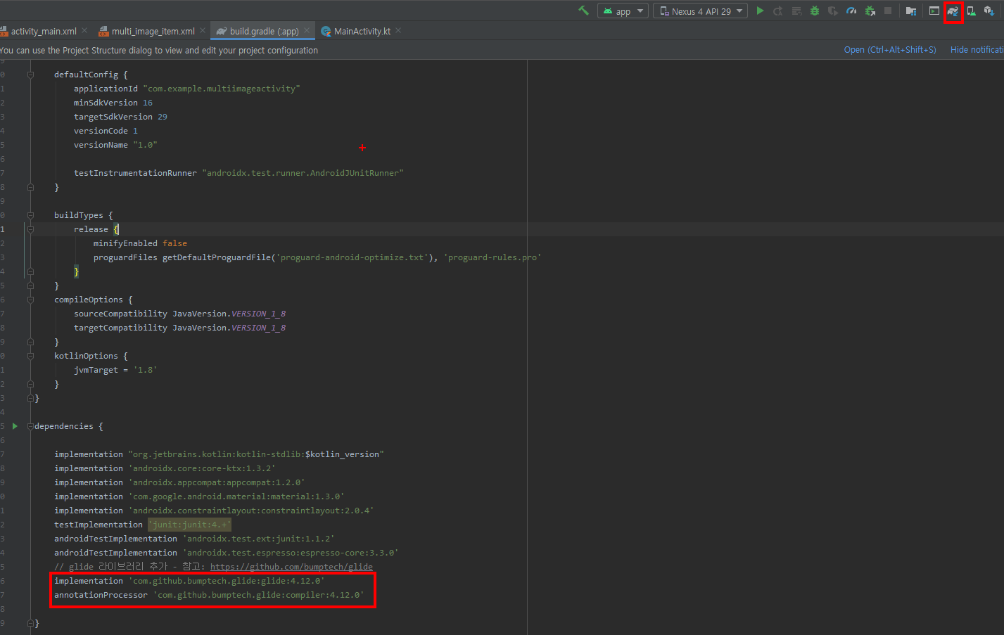 먼저, build.gradle 파일 안에 Glide라는 라이브러리를 사용하기 위해 아래 화면처럼 추가합니다.