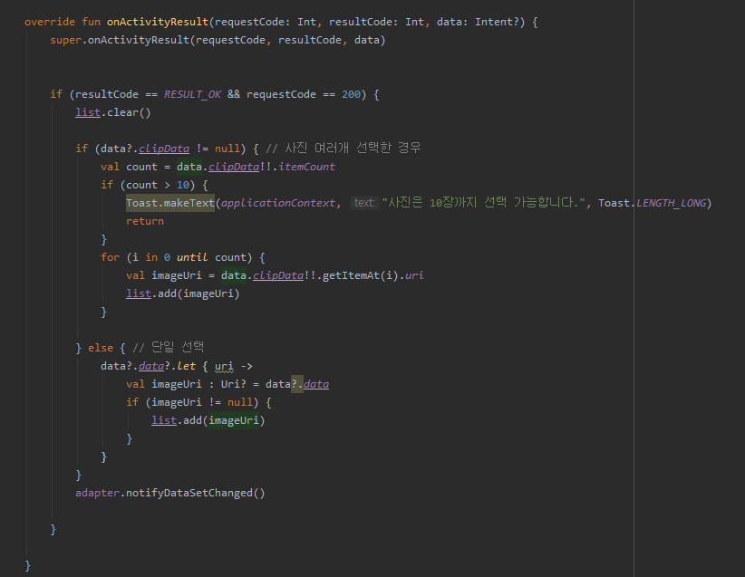 if (data?.clipData != null) { // 사진 여러개 선택한 경우