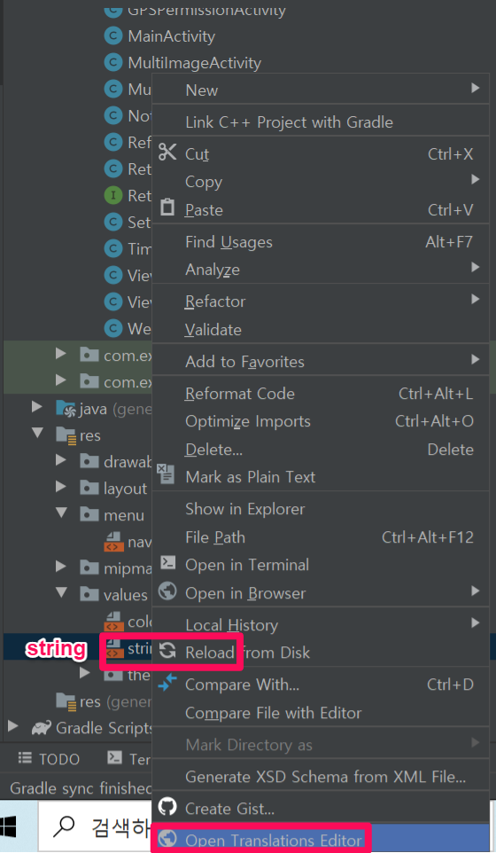 res -> values 폴더의 string.xml 파일을 마우스 우클릭한 후 아래와 같이 Open Translation Editor를 선택해 Translations Editor를 열어줍니다.