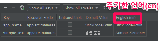 위의 작업을 통해, 앱 언어가 한글일 경우 '샘플 문장'이, 영어일 경우 'Semple Sentence'가 보이도록 해줄 수 있습니다.