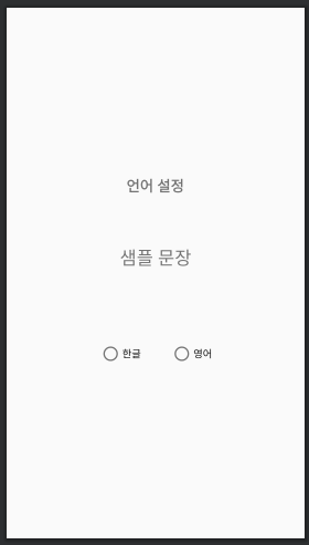 화면 구성은 라디오 버튼과 바뀐 언어를 표시할 TextView로 이루어져 있습니다. 한글 버튼을 클릭시 '샘플 문장'이 보일 것이며 영어 버튼을 클릭하면 'Sample Sentence' 문구가 보이게 될 것입니다.