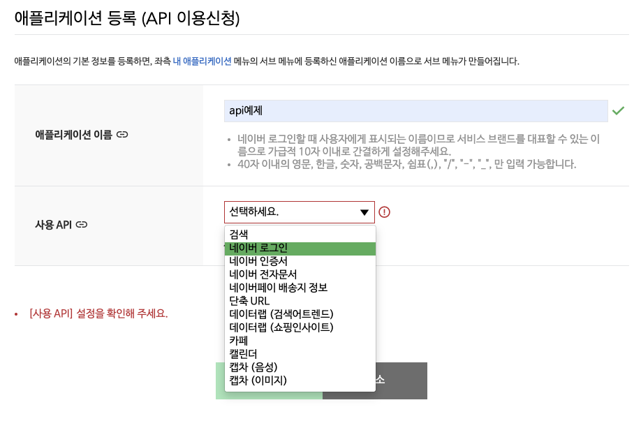 그리고 앱의 이름을 입력한 후 사용 API에서 네이버 로그인을 선택합니다.