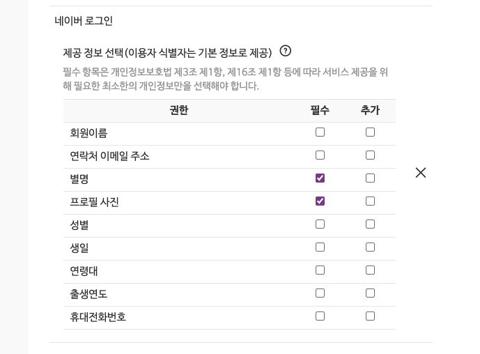 그리고 앱에서 필요한 제공 정보에 체크 합니다.