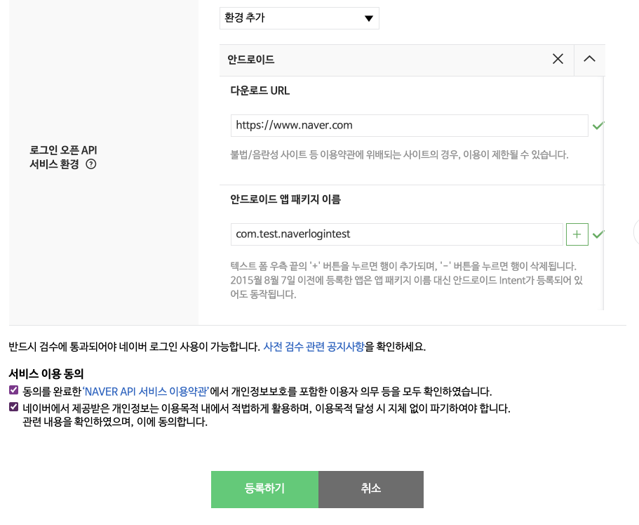 앱 패키지 이름은 안드로이드 스튜디오에서 확인 후 입력하고, 서비스 이용 동의에 체크 후 등록하기를 클릭합니다.