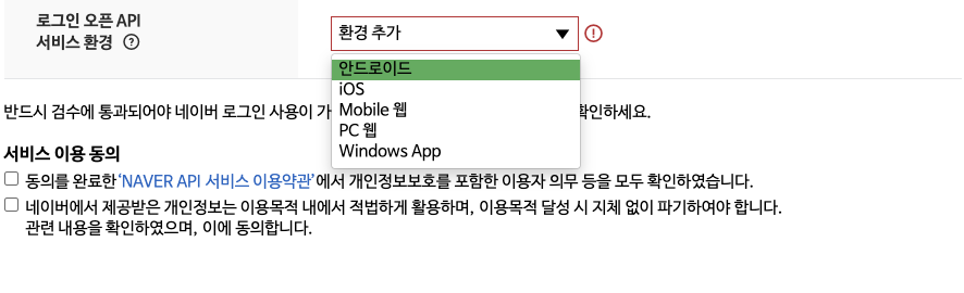 다음으로 api 서비스 환경을 안드로이드로 선택합니다.