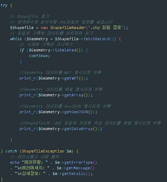 $Shapefile = new ShapefileReader('.shp 파일 경로');