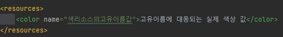 <color></color>: 안드로이드 xml 파일에서 색상 리소스임을 나타내는 태그입니다. 태그 사이에 보여주고자하는 색상 값을 넣습니다.