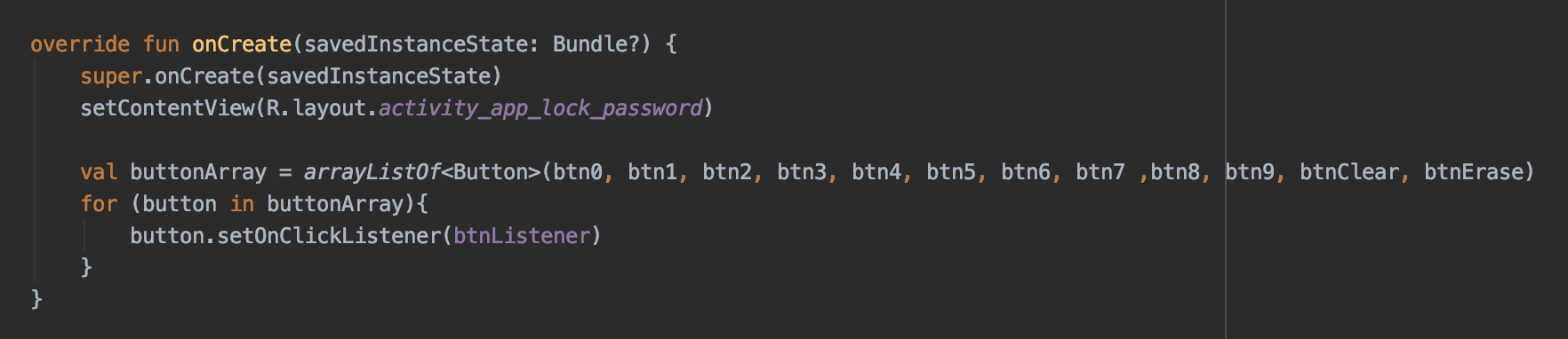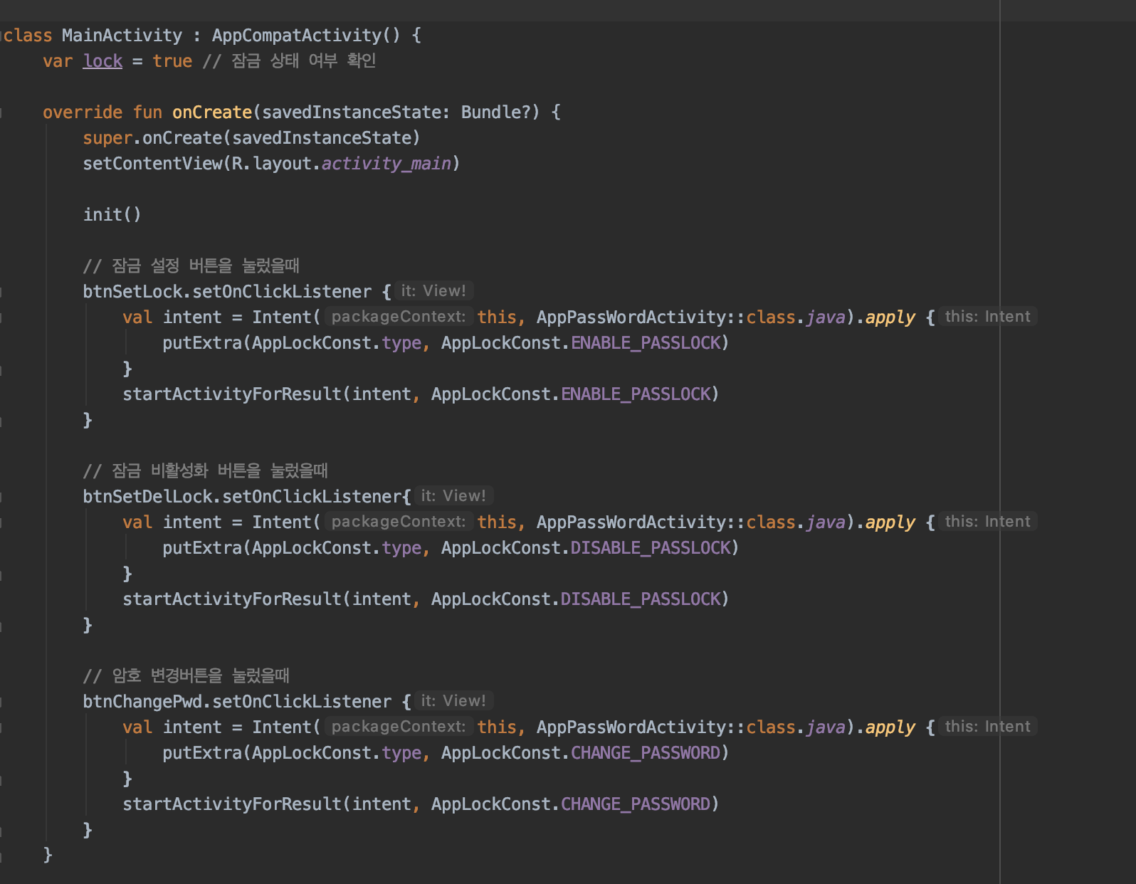다음으로 각 버튼을 눌렀을 때 AppPassWordActivity로 잠금 상태를 보내줍니다.