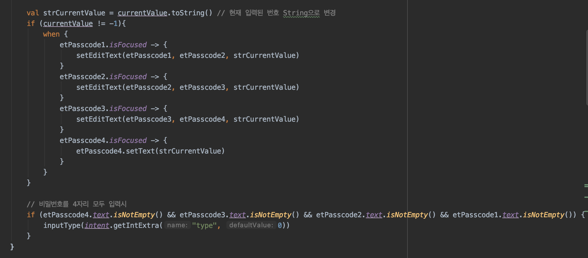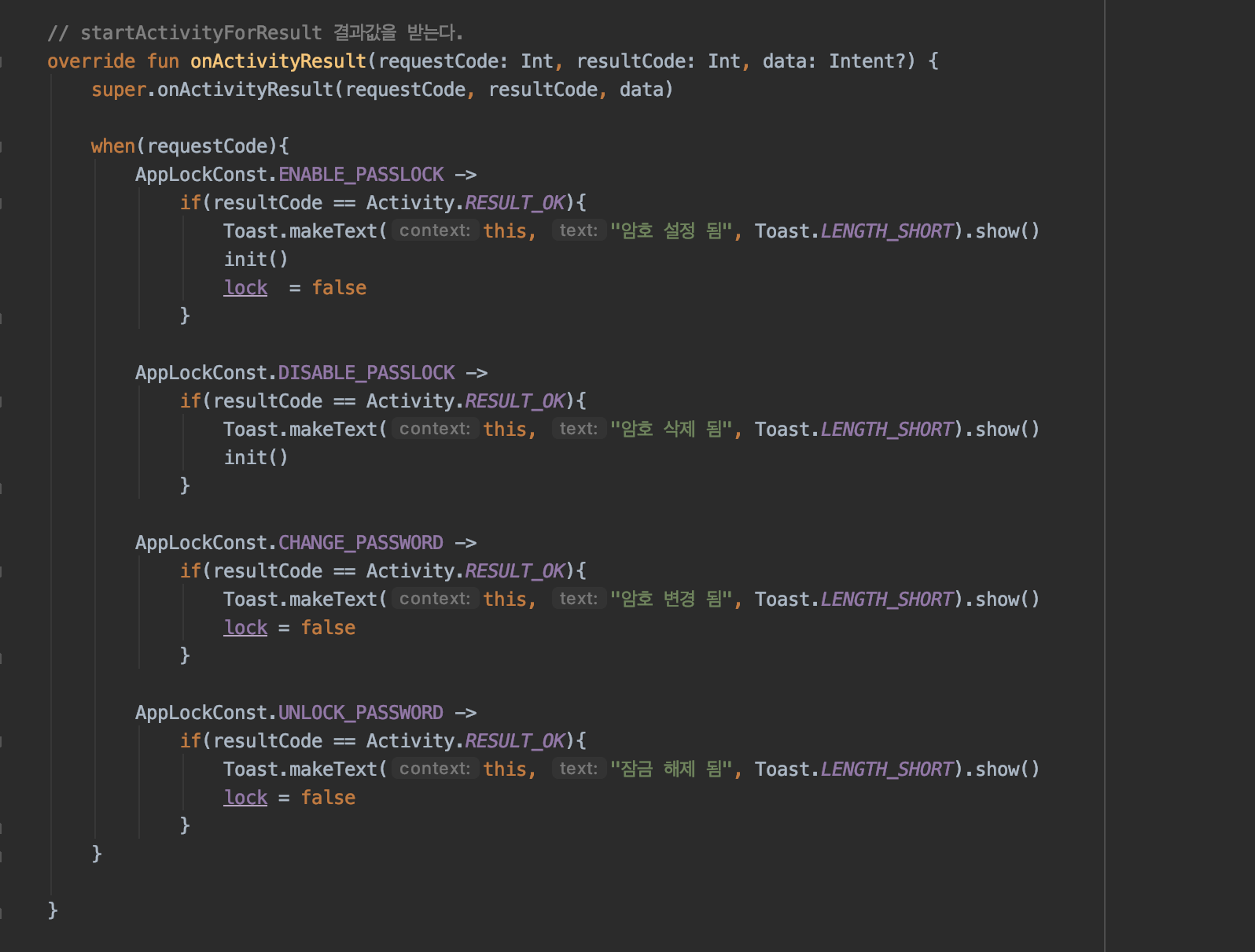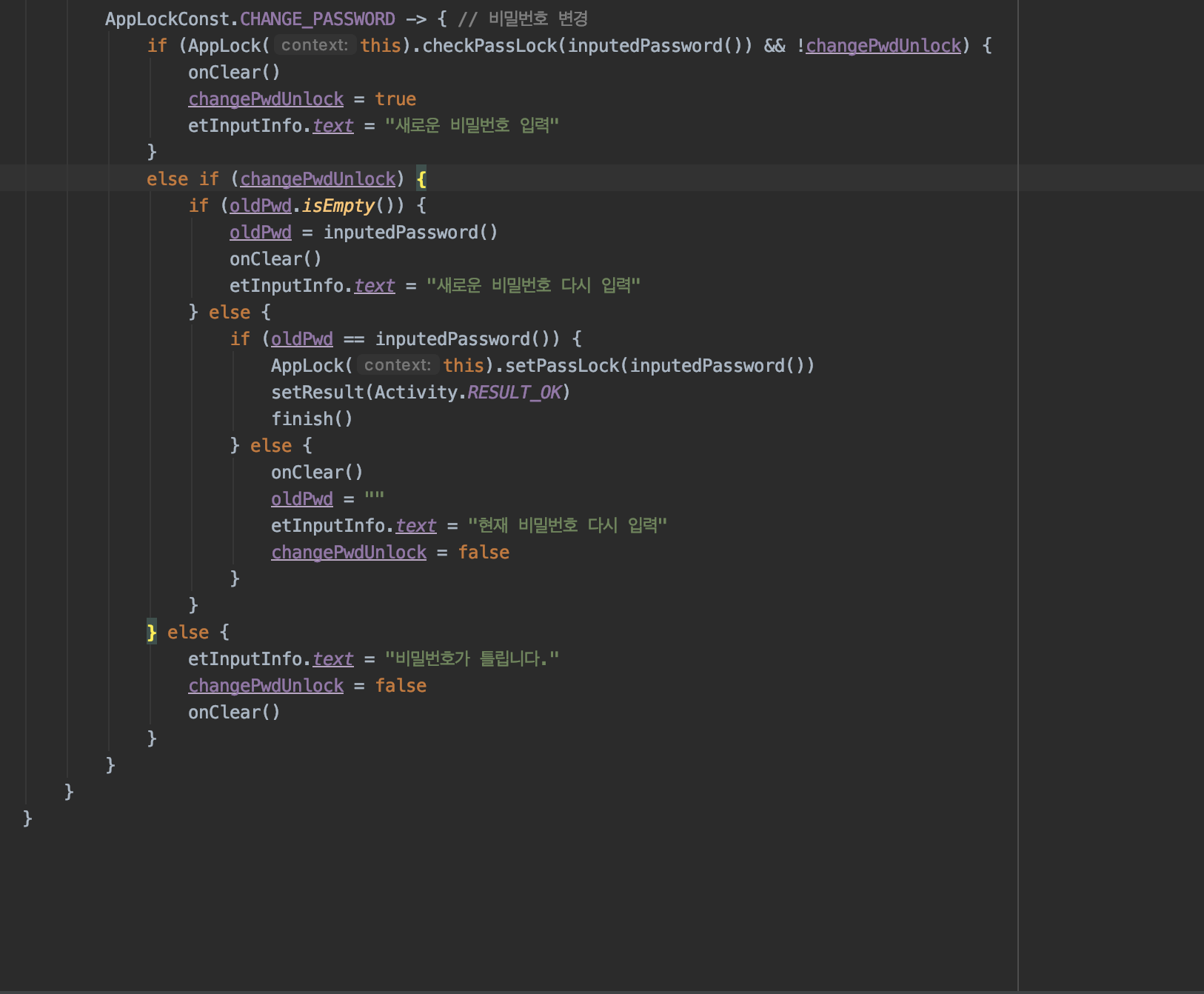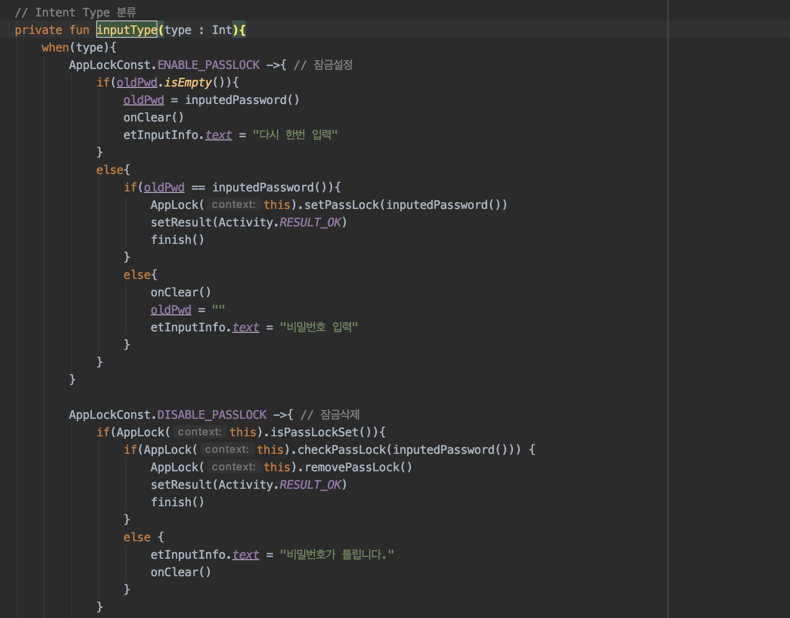 마지막으로 메인액티비티에서 누른 버튼에 따라 비밀번호 입력 창의 용도가 달라지도록 합니다.
