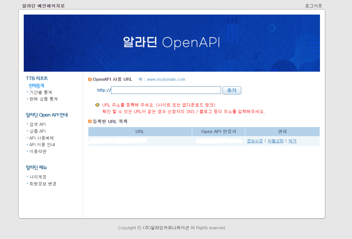 알라딘 오픈 API 안내 페이지 하단에