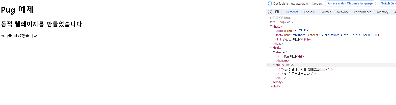 pug를 활용해 만든 웹페이지가 보이는 것을 확인할 수 있습니다.