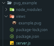 저는 위 이미지와 같이 템플릿 파일들을 모아둘 폴더는 views, pug 파일은 example.pug, express 서버용 파일은 server.js 로 생성했습니다.