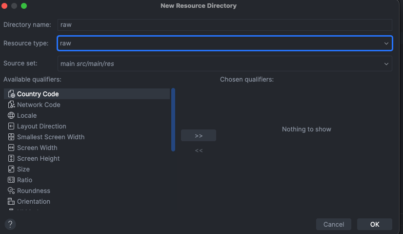위 이미지처럼 리소스 타입을 raw로 놓고 폴더를 생성합니다.