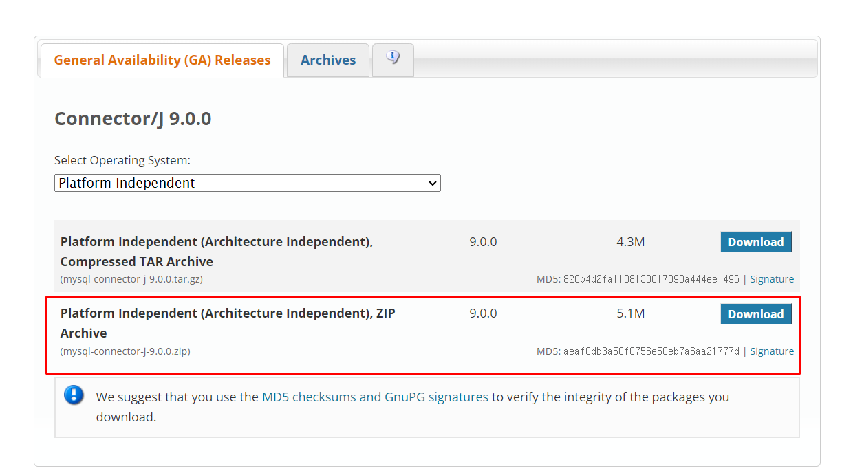 먼저 https://dev.mysql.com/downloads/connector/j/?os=26 에서 mysql-connector-j-9.0.0 파일을 다운 받습니다.