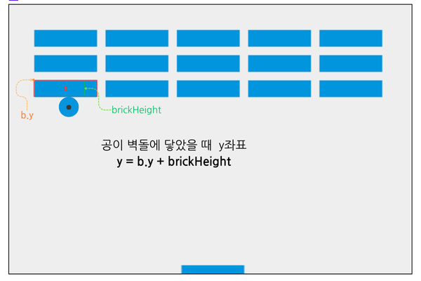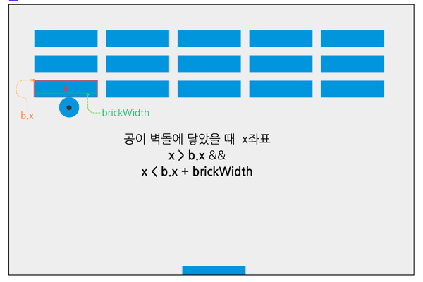 기본적인 개념은 이전과 동일합니다. 공이 특정 벽돌에 닿았다고 판단하는 조건을 위 그림을 통해서 확인하면, 다음과 같이 조건문을 작성할 수 있습니다.