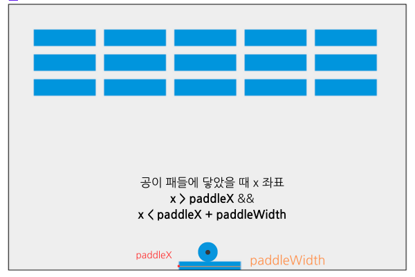 그런데 이때 x 좌표 또한 아래 그림처럼 패들 안쪽에 위치해야 합니다. 즉, 공의 x 좌표는 패들의 가장 왼쪽을 나타내는 paddleX보다는 크고, 패들의 가장 오른쪽 좌표인 paddleX + paddleWidth 보다는 작아야 공이 패들에 닿았다고 할 수 있습니다.