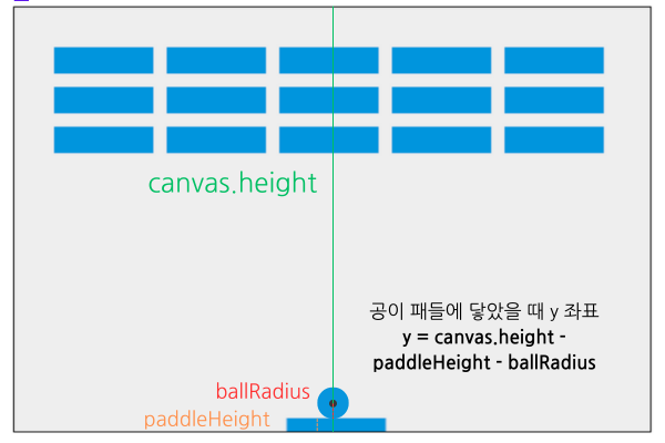y 좌표를 기준으로 봤을 때, 공이 패들에 닿은 순간에는 y 좌표가 cnavas.height(캔버스 세로 길이) - paddleHeight(패들 세로 길이) - ballRadius(공의 반지름) 가 됩니다. 이걸 현재 프레임에 그려져야할 y 좌표에 대한 수식으로 작성하면 다음과 같습니다.