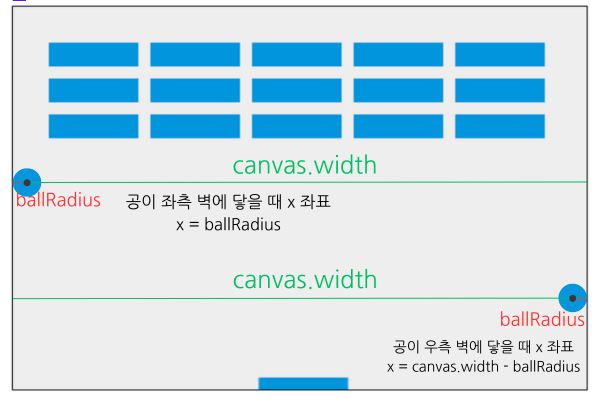 위 사진에서 보이는 것처럼 공의 x 좌표가 ballRadius(공의 반지름) 보다 작으면 벽에 좌측 벽에 닿은 것으로 볼 수 있습니다. 반대로 x 좌표가 canvas.width(캔버스 가로길이) - ballRadius(공의 반지름) 보다 크면 우측 벽에 닿은 것으로 볼 수 있습니다.