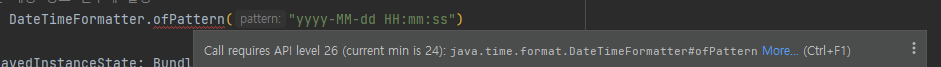 위 이미지 처럼 안드로이드 API 26 레벨 미만인 경우 자바 8버전에서 기본 제공하는 java.time 패키지 등 여러 기능을 지원받지 못합니다.