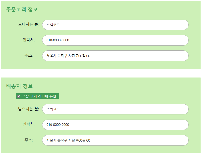 체크가 된 경우엔 주문고객 정보에 입력한 정보를 배송지 정보 input에 값 넣어주도록 코드를 작성했고,
