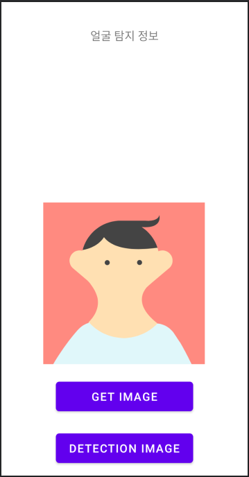 예제에 필요한 레이아웃을 작성해줍니다. GET IMAGE 버튼을 통해 갤러리에 있는 얼굴 사진을 불러옵니다. 그 후 DETECTION IMAGE 버튼을 통해 가져온 사진을 탐지한 후 결과를 위에 텍스트로 보여줄 예정입니다.