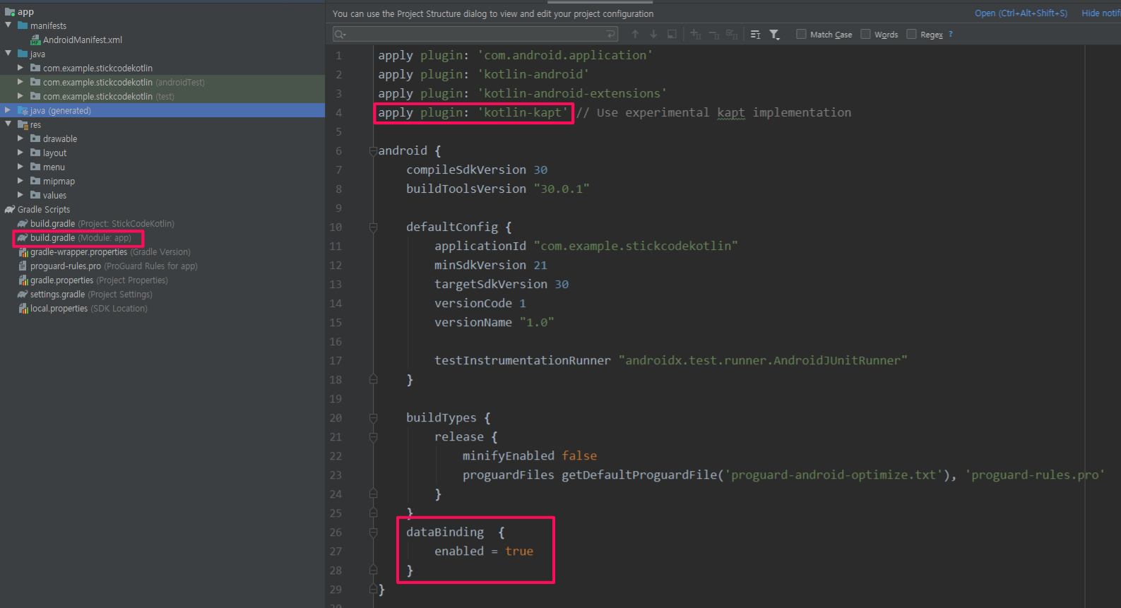 Data Binding을 사용하기 위해서 build.gradle (App 단위) 에서 android에 viewBinding 태그를 만들고 enabled 속성을 true로 설정해줍시다.
