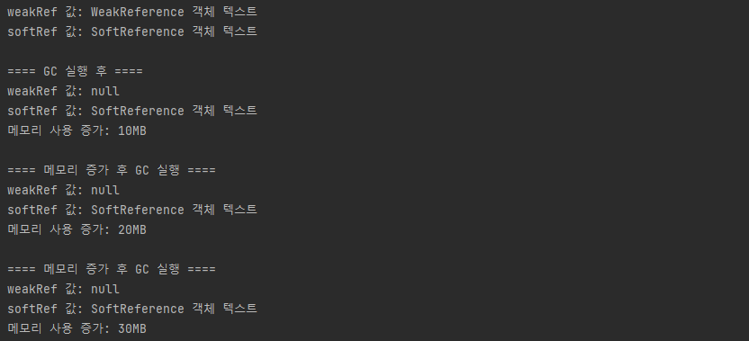 처음에는 WeakReference 와 SoftReference 의 각 객체에 담긴 텍스트가 잘 출력됩니다.